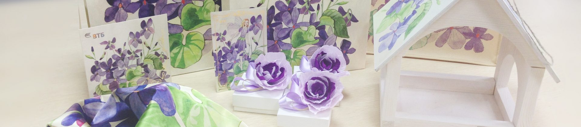 РЕАЛИЗАЦИЯ: Нежный акварельный рисунок фиалок лег в основу всей концепции подарка к 8 марта. Для бумажных пакетов были подобраны ручки в тон цветов, а рисунок на открытках обыграли с помощью золотых вензелей. Этот же принт был использован и для декора кормушки.