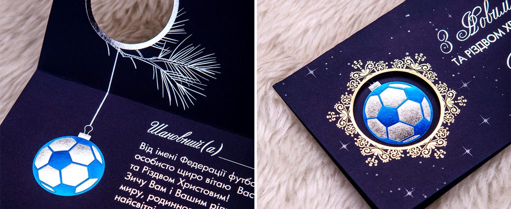 РЕАЛИЗАЦИЯ: Чтобы придать пакетам изысканности, орнамент был нанесен золотом. При изготовлении открыток, было использовано несколько техник постпечатной обработки, в первую очередь – для достижения визуального эффекта объемности мяча.